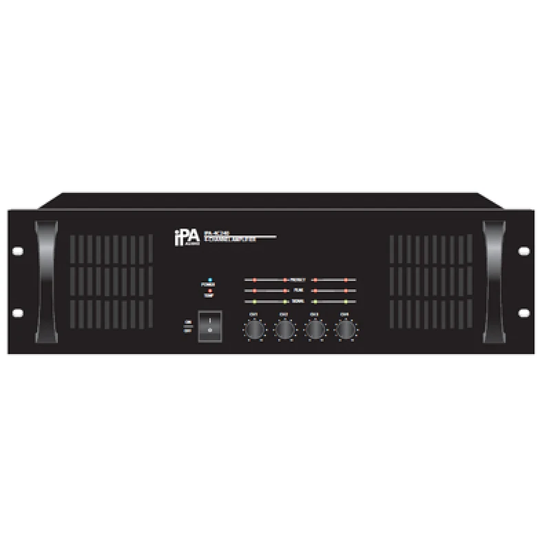 Чотириканальні підсилювачі потужності IPA-4С240 використовуються в системах озвучування та пожежного оповіщення IPA AUDIO для посилення вхідних сигналів та подальшої трансляції в лінії гучномовців. Підсилювач потужності являє собою чотири незалежні підсилювачі потужності, розташованих в одному корпусі. Номінальна потужність підсилювачів: 4х240 Вт. Сумарна потужність динаміків на підключених лініях повинна бути не більше 80% від номінальної потужності кожного каналу підсилювача.