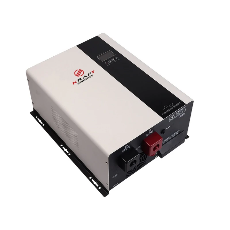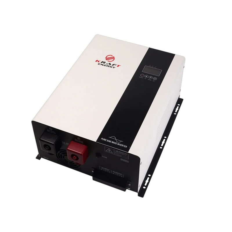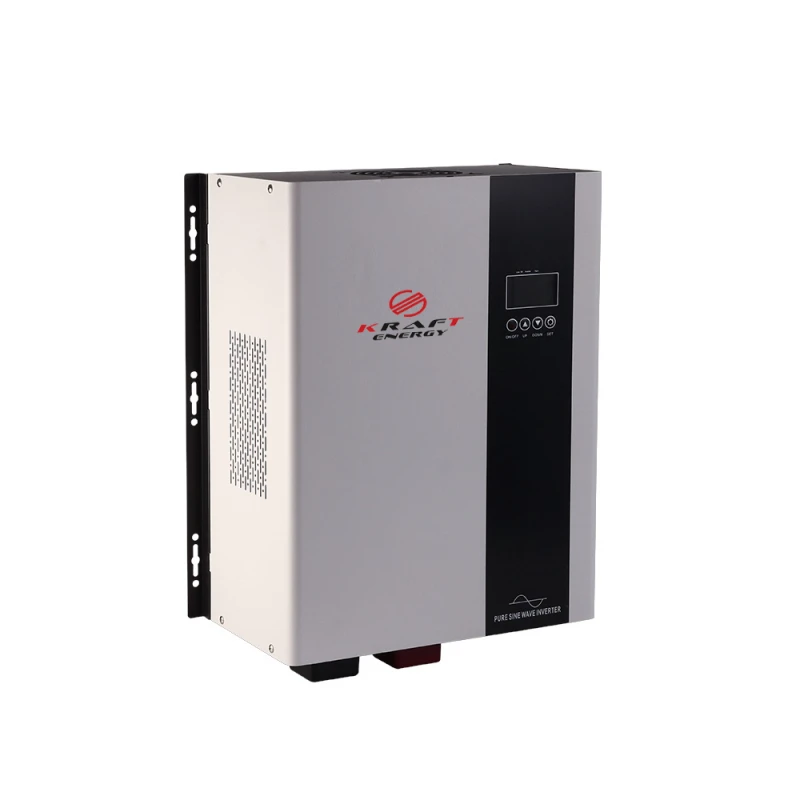 Автономний однофазний інвертор Kraft KRF-SI6KW з максимальною потужністю 6 кВт (максимальна короткочасна потужність 7.8 кВт), з вбудованим зарядним пристроєм (струм заряду 2-50 А) та правильною синусоїдою на виході. Напруга акумуляторної системи 48 В, підтримка заряду акумуляторних батарей типу AGM/GEL/LI та ручний режим. Вхідна напруга 230 В ± 25%, ККД: >85 % / вихідна напруга 230 В ± 10 %.