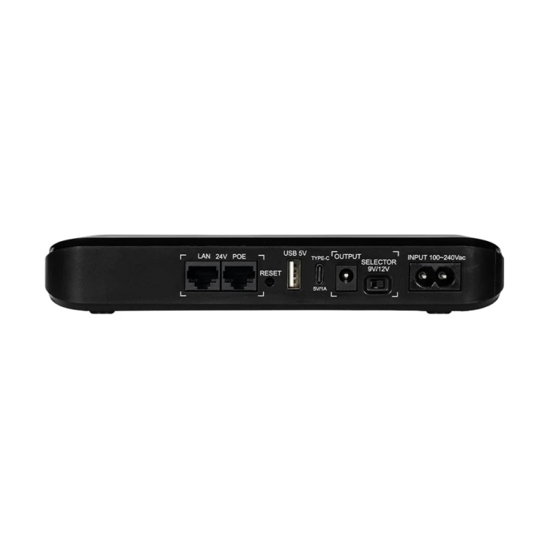 Вихідні інтерфейси USB, Type-C, DC, PoE, вихідна напруга 5 В (USB) + 5 В (Type-C) + 9/12 В (DC) – перемикається + 24 В (PoE). Вихідна напруга та струм кожного виходу: USB: 5 В/2 А, Type-C: 5 В/1 А, DC: 9 В/2 А, 12 В/1,5 А, PoE: 24 В/0,7 А