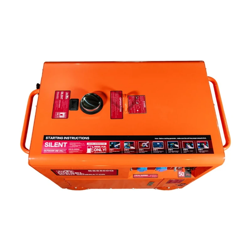 Генератор дизельний; номінальна потужність 5 кВт; максимальна потужність 5.5 кВт; однофазний; вихідна напруга 220 В; 2 розетки 220 В; тип запуску: електричний стартер / ручний; робоча частота 50/60 Гц. Двигун: одноциліндровий, вертикальний, чотиритактний дизельний двигун з повітряним охолодженням, об'ємом 456 см.куб.; об'єм паливного бака 14.5 л; об'єм баку для оливи: 1.65 л; максимальні витрати палива 2.2 л/год; повітряне охолодження; вбудований контролер. Розміри 910 / 530 / 740 мм, вага 180 кг