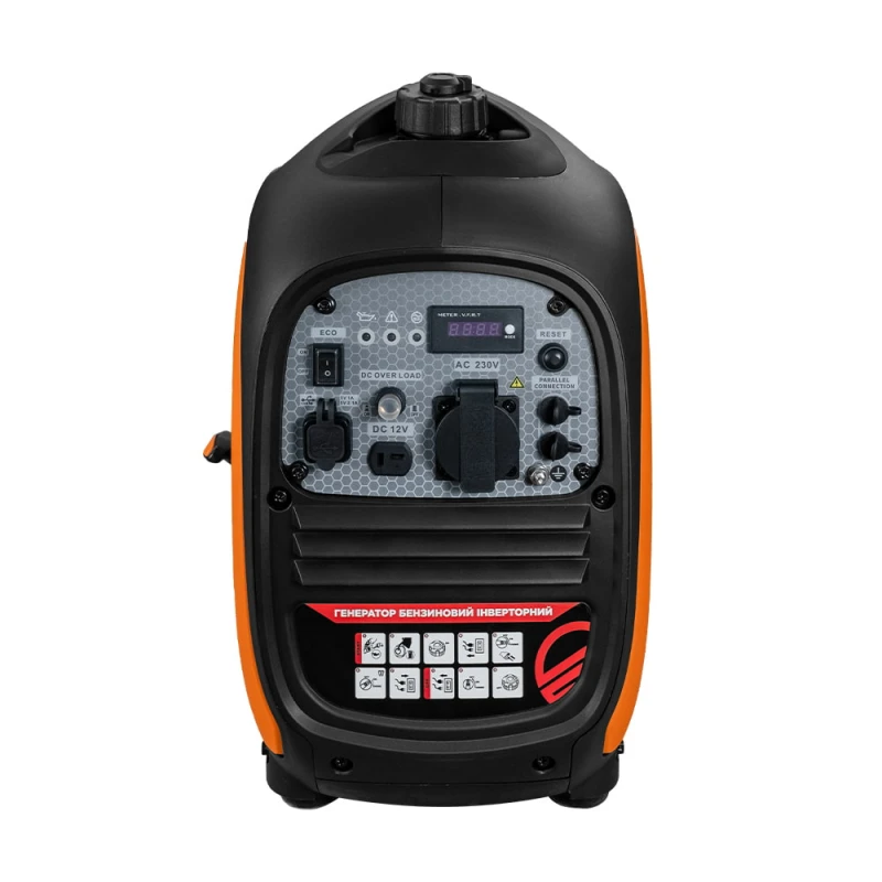 Генератор інверторний бензиновий; номінальна потужність 2.2 кВт; максимальна потужність 2.4 кВт; однофазний; вихідна напруга 220 В; 1 розетка 230 В; регулятор напруги; тип запуску: ручний. Двигун: одноциліндровий чотиритактний OHV з об’ємом 97.7 см.куб., з примусовим повітряним охолодженням; об’єм паливного баку 4 л, об’єм мастила у картері 0.6 л. VFT-метр, USB-вихід, захист від перевантаження і низького рівня мастила, можливість паралельного підключення. Розміри 540 / 330 / 545 мм, вага 18.5 кг. Ручка для транспортування