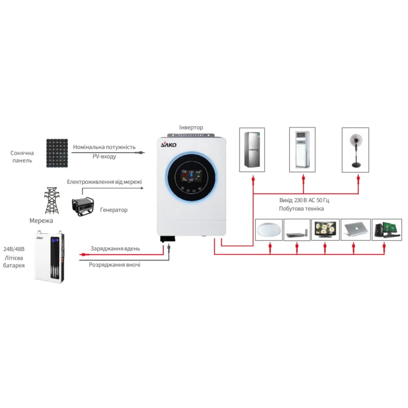 Гібридний інвертор 6.5kVA/6.2kW Sako SUNON V 6.5KW/48V+120A MPPT