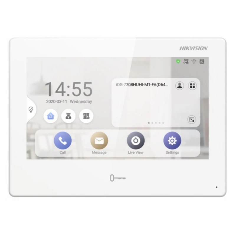 IP-відеодомофон DS-KH9310-WTE1(B) з кольоровим сенсорним 7-дюймовим екраном, підтримкою SIP-сервера, вбудованим Wi-Fi з можливістю переадресації виклику на мобільний телефон, записом фото у пам'ять пристрою. Колір – білий.