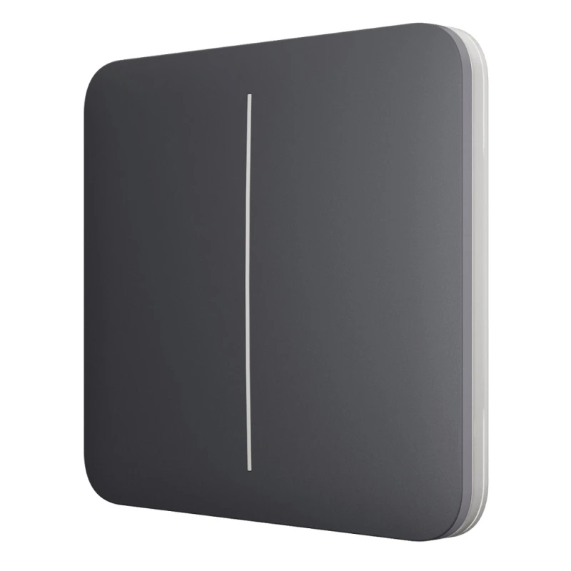 Кнопка Ajax SoloButton (2-gang) graphite – складова частина розумного вимикача світла LightSwitch. Сенсорна панель підходить для встановлення двоклавішного вимикача LightSwitch. У лінійці передбачено 8 кольорів сенсорних панелей для вимикачів. Кнопка з'єднується з реле LightCore механічно, без використання інструментів. У лінійці пристроїв Ajax є два формати вимикачів LightSwitch: одинарні та комбіновані. Одинарний вимикач складається з двох елементів: реле LightCore і сенсорної панелі SoloButton.