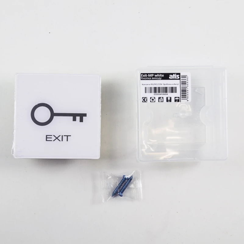 Кнопка ATIS Exit-MP white встановлюється врізним способом, що передбачає попередню підготовку поверхні для встановлення. Форма пластини забезпечує інтуїтивне використання: досить легкого натискання для активації механізму. Пристрій має автоматичне скидання, тобто після активації не потрібне ручне перезавантаження.