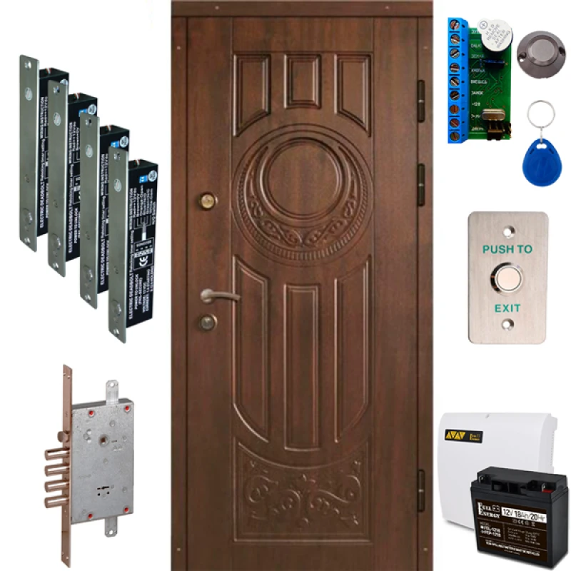 бронедвері ТИТАН GSM з пристроєм GSM-оповіщення та GSM-відкриття замкумеханічний замок врізний Mottura 85.971электроригельный замок YB-700A(LED) – 4 шт.автономний контролер Z-5Rприхований міні-зчитувач CP-Z-2L Baseкнопка виходу PBK-814B(LED)безконтактний брелок RFID KEYFOB EM-Blueблок безперебійного живлення BBGP-1210, імпульсний, 2-канальнийакумулятор FEP-1218, 18Ah/12В