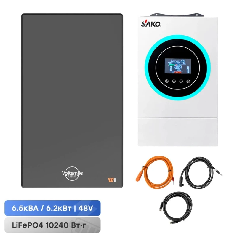 Комплект резервного живлення: гібридний інвертор Sako SUNON V 6.5KW/48V і акумуляторна батарея 51.2В Voltsmile W1 Classic. Інвертор: гібридний однофазний інвертор; максимальна потужність 6.5 кВА/6.2 кВт, максимальна короткочасна потужність 12.4 кВА; правильна синусоїда на виході 220 В; вбудований MPPT-контролери та мережевий зарядний пристрій; максимальний струм заряду 120 А; вхідна напруга 90-280 В; діапазон напруги від сонячних панелей 60-450 В, макс. потужність 6000 Вт; ККД 93%; вихідна напруга 230 В ±5%; вихідна частота 50/60 Гц; напруга акумуляторної системи 48 В; час перемикання на АКБ 10 мс; підтримка заряду АКБ типу AGM/GEL/LiFePo4/Li-ion; вбудований локальний WiFi – лише для моніторингу з мобільного застосунку; LCD-дисплей; функція «холодного» пуску; режим підмішування; захист від перевантаження, короткого замикання, перегріву; робоча температура -10°C~+50°C; розміри 583 / 380 / 214 мм, вага 10.4 кг. Акумуляторна батарея: настінна літій-залізо-фосфатна акумуляторна батарея для системи накопичення енергії; напруга 51.2 В; ємність 200 Аг / 10240 Втг; максимальний струм заряду/розряду 100 А/100 А; ресурс: 6000 циклів заряджання-розряджання; комунікаційні порти CAN, RS485; клас захисту IP67; в одну систему можна підключити до 16 акумуляторних модулів; розміри 888 / 518 / 150 мм; вага 90 кг. Комплект кабелів для підключення акумуляторних батарей Voltsmile серій W, V, RPC до інвертора містить: кабель живлення від акумулятора до інвертора «+» 4AWG, довжина 2 м – 1 шт.; кабель живлення від акумулятора до інвертора «-» 4AWG, довжина 2 м – 1 шт.; кабель зв’язку між акумулятором та інвертором 4AWG, довжина 2 м – 1 шт.