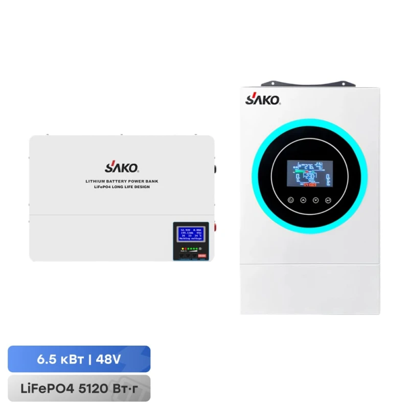 Комплект резервного живлення Sako: гібридний інвертор 6.5kVA/6.2kW SUNON V 48V+120A MPPT й акумуляторна батарея 51.2В 5120Втг Li-Wall series LiFePo4. Гібридний однофазний інвертор; максимальна потужність 6.5 кВА/6.2 кВт, максимальна короткочасна потужність 12.4 кВА; правильна синусоїда на виході 220 В; вбудований MPPT-контролер та мережевий зарядний пристрій; максимальний струм заряду 120 А; вхідна напруга 90-280 В; діапазон напруги від сонячних панелей 60-450 В, макс. потужність 6000 Вт; ККД 93%; вихідна напруга 230 В ±5%; вихідна частота 50/60 Гц; напруга акумуляторної системи 48 В; час перемикання на АКБ 10 мс; підтримка заряду АКБ типу AGM/GEL/LiFePo4/Li-ion; вбудований локальний WiFi – лише для моніторингу з мобільного застосунку; LCD-дисплей; функція «холодного» пуску; режим підмішування; захист від перевантаження, короткого замикання, перегріву; робоча температура 0°C~+50°C; розміри 583 / 380 / 214 мм, вага 10.4 кг. Настінна літій-залізо-фосфатна акумуляторна батарея для системи накопичення енергії; напруга 51.2 В; ємність 100 Аг, потужність 5120 Втг; максимальний струм заряду/розряду 50 А/100 А; ресурс: 5000 циклів заряджання-розряджання; комунікаційний порт RS485; клас захисту IP20; в одну систему можна підключити до 15 акумуляторних модулів; розміри 538 / 372 / 177 мм; вага 42.5 кг