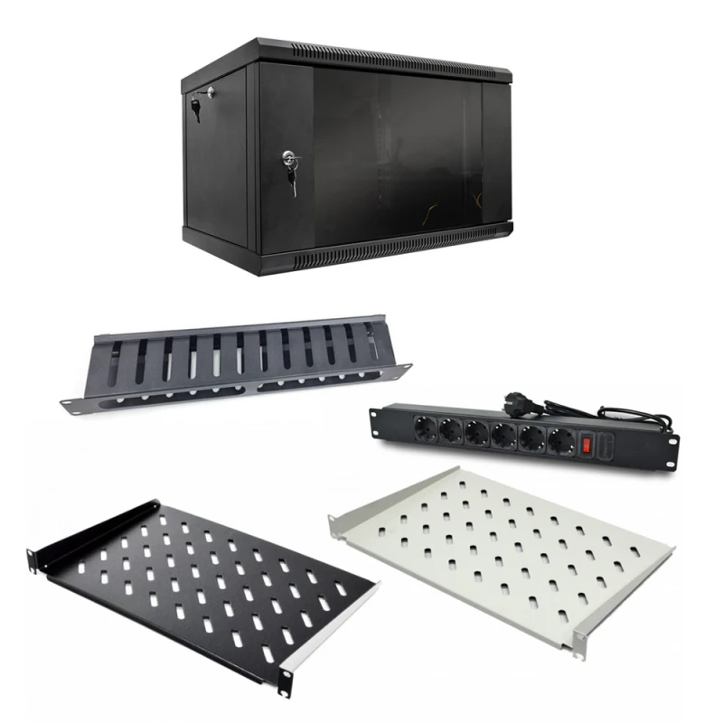 Комплект: Шафа серверна SteelNet 7U 600 x 400 черный + Блок розеток 1U 19" на 6 розеток з вимикачем + Організатор кабелю перфорований із кришкою 19" + Полиця консольна CMS UA-SHC300G + Полиця консольна CMS UA-SHC300B