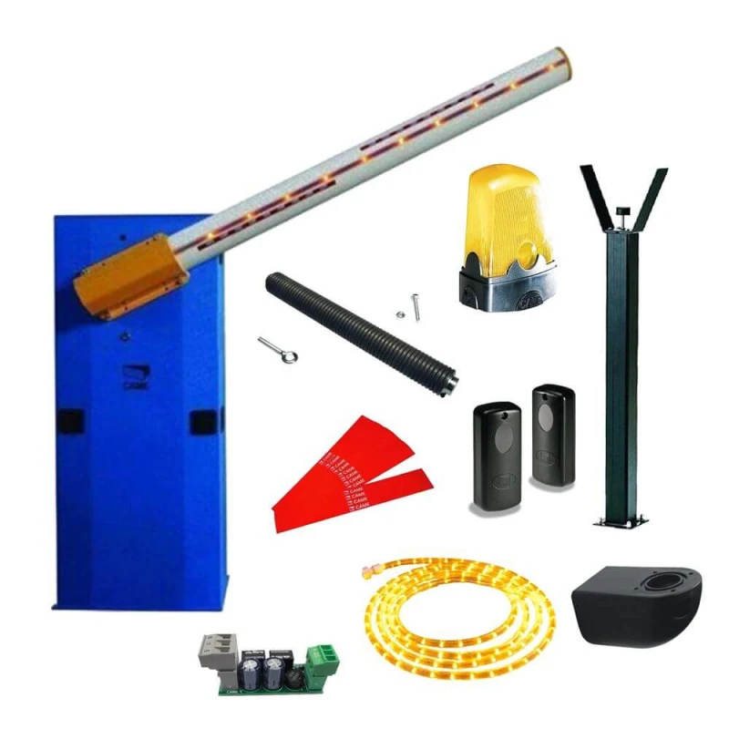 стійка шлагбауму з вбудованою панеллю управління, 2 круглі стріли діаметром 100 мм і довжиною 6.85 м, 2 пружини балансування діаметром 50 мм, нерухома стійка під стрілу, дюралайт LED довжиною 13 м червоно-зелений з блоком для підключення, 10 накле (передавач та приймач), сигнальна лампа 24 В та кріплення для сигнальної лампи