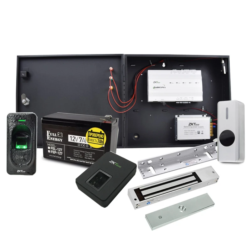 контролер, 2 біометричні зчитувачі, електромагнітний замок, куточок монтажний для замку, кнопка виходу, акумулятор 12В 7 Ач, програмне забезпечення