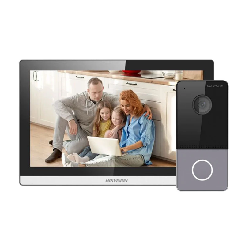 Комплект відеодомофона складається з кольорового відеодомофона з сенсорним екраном 7 дюймів Hikvision DS-KH6350-TE1 і кольорової панелі виклику Hikvision DS-KV6103-PE1(C) роздільною здатністю 2Мп (1080p) з накладним способом установки. До домофона можна підключити 5 додаткових відеопанелей або моніторів.