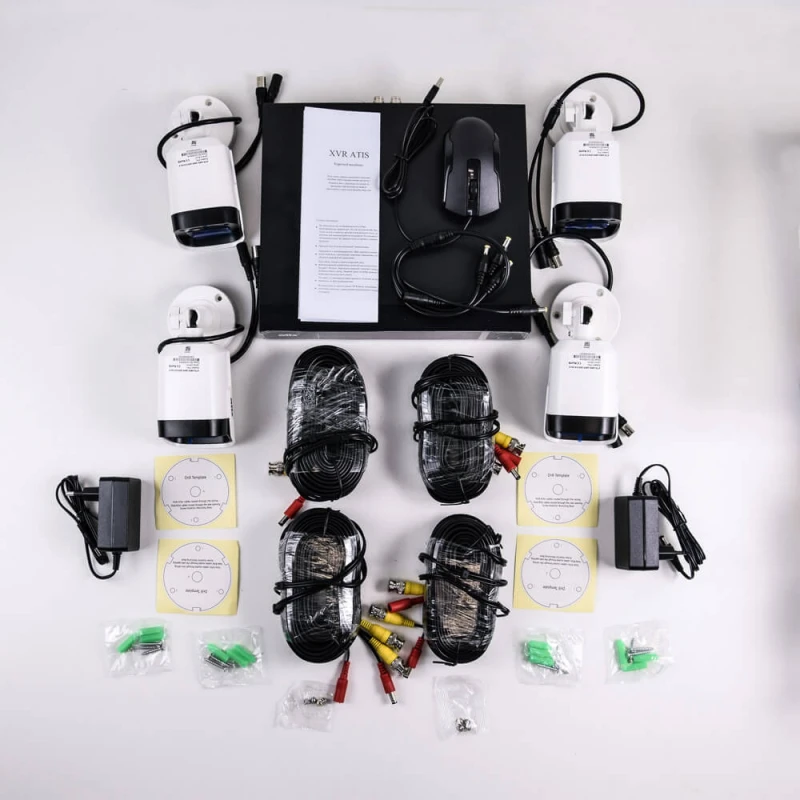 Комплект відеоспостереження ATIS kit 4 ext містить: 1 відеореєстратор ATIS XVR 3104 (з USB-мишею та блоком живлення), 4 циліндричні зовнішні відеокамери ATIS AMW-2MIR-20W/3.6 Lite-S Full HD роздільної здатності, 2 адаптери живлення DC 12 В, 4 коаксіальні кабелі по 18 м, 1 кабель розгалужувач живлення.