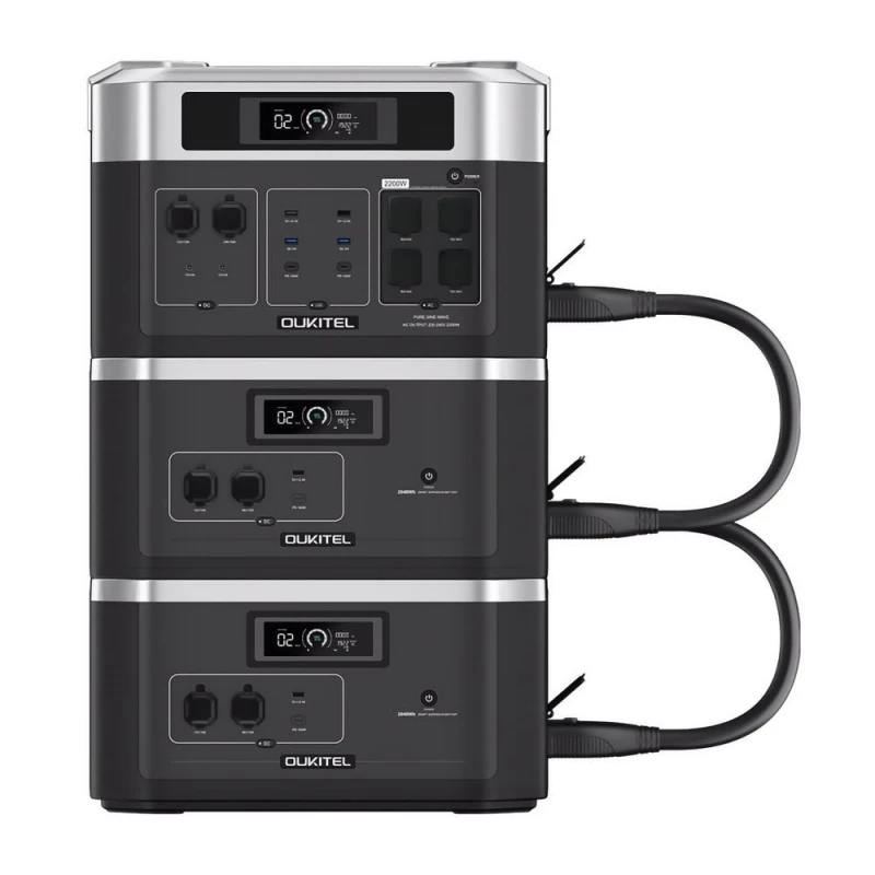 Портативне джерело живлення потужністю 2200 Вт/200-240 В (чиста синусоїда), з режимом ДБЖ, пікова потужність 4000 Вт; можливість збільшення потужності до 16 кВт за допомогою макс. підключення 7 додаткових батарей B2000. Вбудована LiFePO4 акумуляторна батарея потужністю 2048 Втг (51.2В/40Аг); вбудований зарядний пристрій 1800 Вт; вхід для сонячних панелей 12-120В/15А 1000 Вт макс.; вхід автомобільної зарядки: 12В/8А, 24В/10А; вихід змінного струму: 5 портів 200-240 В 2200 Вт; вихід постійної напруги: 2 порти DC5521 12В/3А загальною потужністю 36 Вт, 1 вихід автомобільної зарядки («прикурювач») 12В/10А 120 Вт, 1 порт GX16 4Pin 24В/10А 240 Вт; вихід USB (тип А) 2 шт. 5В/2.4А з максимальною потужністю 12 Вт кожен; вихід USB (тип А) 2 шт: QC3 (18 Вт макс); PD-вихід 2 шт: 5В/2.4А, 9В/3А, 12В/3А, 15В/3А, 20В/5А (100 Вт макс.); кількість циклів розряду-заряду АКБ ≥3500; час до повної зарядки АКБ 1.5 години; робоча температура 0 °C ~ +40 °C; розміри 480 / 296 / 322 мм, вага 23.6 кг. Додаткова акумуляторна батарея типу LiFePO4 потужністю 2048 Втг (51.2В/40Аг) для портативної зарядної станції OUKITEL BP2000E; макс. підключення 7 додаткових батарей (паралельно); вхід змінного струму для підключення адаптера живлення 200 Вт; вхід для сонячних панелей: 12-48В/10А 200 Вт макс.; вхід автомобільної зарядки: 12В/8А, 24В/10А; вихід постійної напруги (DC): 1 вихід автомобільної зарядки («прикурювач») 12В/10А 120 Вт, 1 порт XT90 48В/15А 720 Вт; порт USB-A: 5В/2.4А з потужністю 12 Вт; порт USB-C: PD-вихід 100 Вт 5В/3А, 9В/3А, 12В/3А, 15В/3А, 20В/5А; можливість розширення потужності системи до 16 кВт за допомогою паралельного підключення 7 додаткових батарей; кількість циклів розряду-заряду АКБ ≥3500; робоча температура 0 °C ~ +40 °C; розміри 474 / 295 / 241.5 мм, вага 18.6 кг