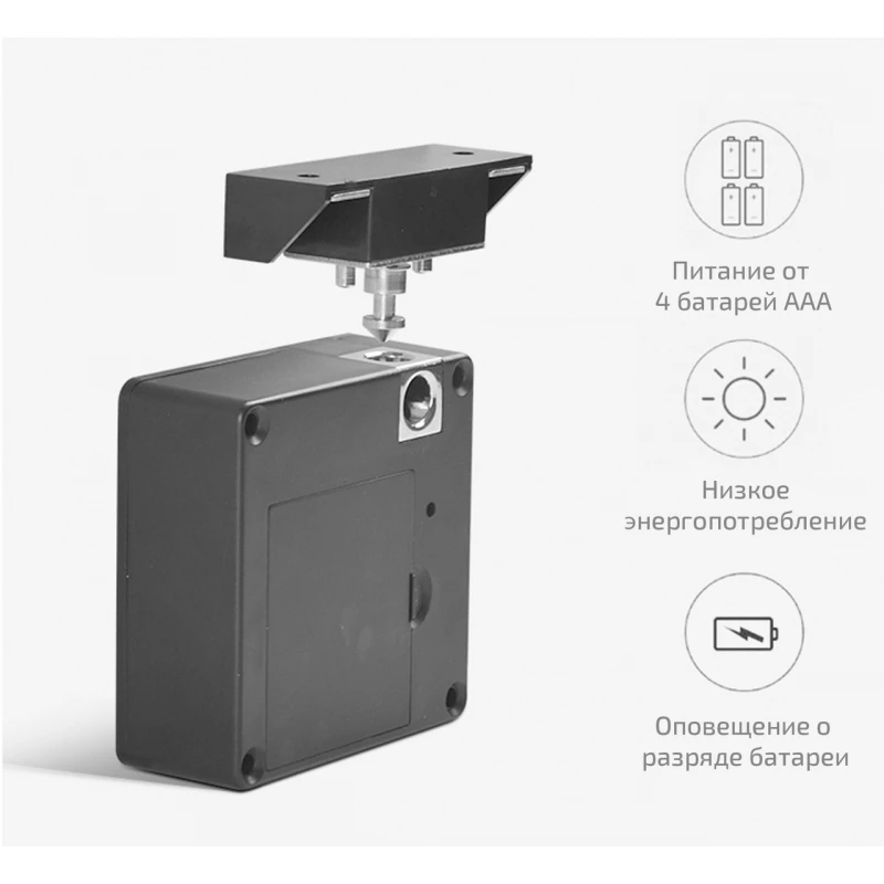 Пристрій має вбудований контролер і зчитувач для безконтактних карток MIFARE і Bluetooth, таким чином є повністю готовим рішенням. Установка даного замку справа дуже проста, для цього вам знадобиться всього лише викрутка. Зчитувач даного пристрою дозволяє заховати замок всередині шафи і з зовнішнього боку він не буде видно