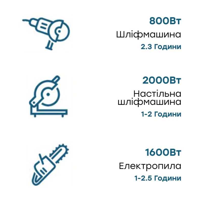 Портативне джерело живлення потужністю 2000 Вт/200-240 В (чиста синусоїда), з режимом ДБЖ, пікова потужність 4000 Вт. Вбудована LiFePO4 акумуляторна батарея потужністю 2000 Втг (51.2В/39.1Аг); вбудований зарядний пристрій 1100 Вт; вхід для сонячних панелей 12-48В/15А 500 Вт макс.; вхід автомобільної зарядки: 12В/8А, 24В/10А; вихід змінного струму: 3 порти 200-240 В 2000 Вт; вихід постійної напруги: 2 порти DC5521 12В/3А, 1 вихід автомобільної зарядки («прикурювач») 12В/10А, XT60 12В/10А; вихід USB (тип А) 2 шт. 5В/2.4А з максимальною потужністю 12 Вт кожен; вихід USB (тип А) 2 шт: QC3 (18 Вт макс); PD-вихід 2 шт: 5В/2.4А, 9В/3А, 12В/3А, 15В/3А, 20В/5А (100 Вт макс.); кількість циклів розряду-заряду АКБ ≥3500; час до повної зарядки АКБ 1.8 години; вбудований LED-прожектор 2 Вт; робоча температура 0 °C ~ +40 °C; розміри 394 / 279 / 330 мм, вага 22 кг