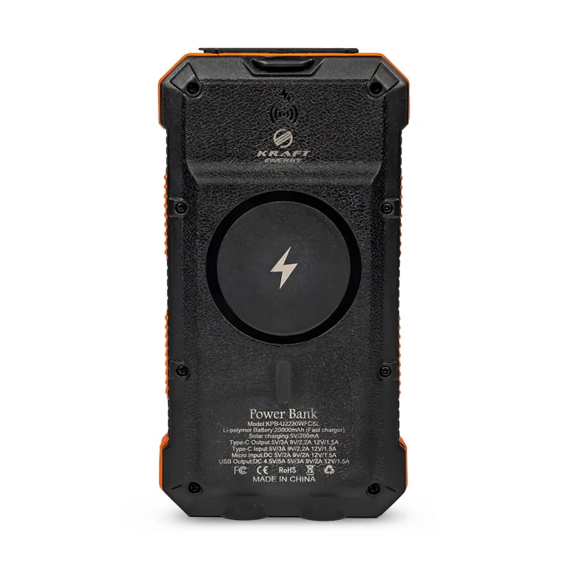 Повербанк Kraft KPB-U2230WFCSL Orange з сонячною панеллю, з бездротовою зарядкою. Ємність батареї 20000 мАг, літій-полімерна технологія, інтерфейси: вхід microUSB 5 В/2.1 А, вхід/вихід Type-C PD 22.5 Вт 5 В/3 А, 9 В/2 А, 12 В/1.8 А, вихід 2*USB 5 В/3.5 А, 12 В/2.1 А. Роз'єм USB Type-C підходить і для заряджання підключених пристроїв, і для заряджання самого повербанку. Вбудований LED-ліхтар з 3 режимами миготіння.