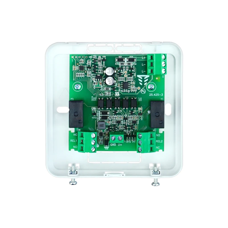Подключается в адресный интерфейс и добавляет 2 мощных реле, которые способны коммутировать напряжение как постоянного, так и переменного тока. Оснащен изолятором короткого замыкания.