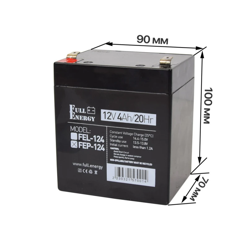 Аккумулятор FEP-124 от компании Full Energy применяется для установки в бесперебойные блоки питания, пульты охранной сигнализации, компьютерные бесперебойники (UPS), детские электромобили, в составе преобразователей и т.п.