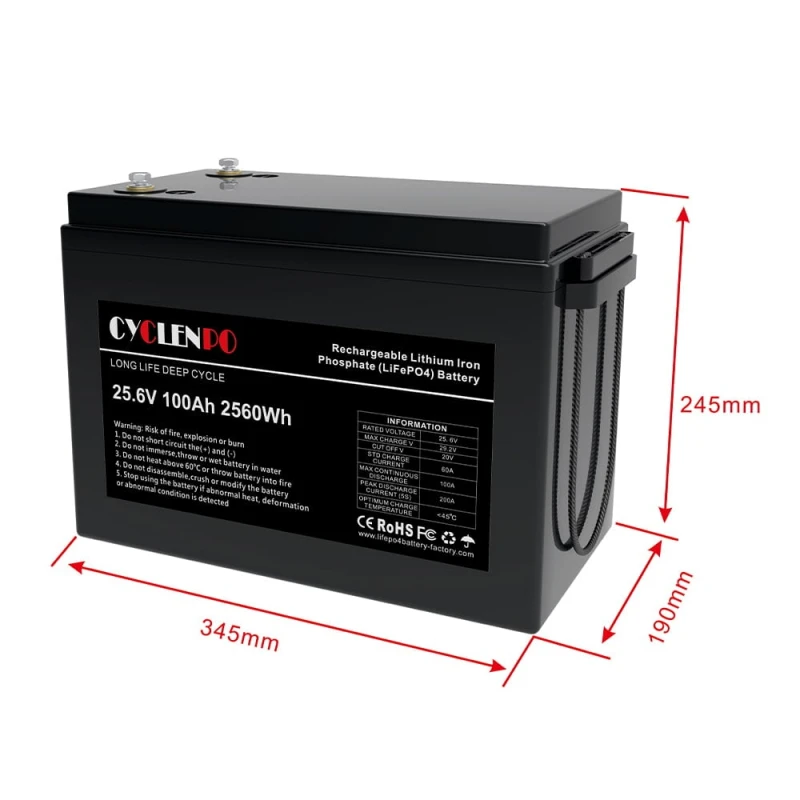 Акумуляторна батарея літій-залізо-фосфатна (LiFePO4); ємність 100 Аг; напруга 25.6 В; макс. струм заряду 60 А / розряду 100 А; кількість циклів: > 6000; можливість послідовного підключення до 2 акумуляторів; клас захисту IP67; розміри 345 / 190 / 245 мм; вага 18.42 кг