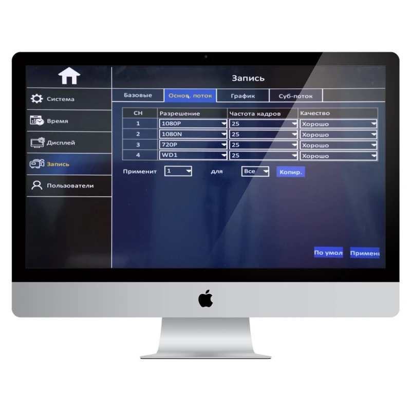 - максимальное разрешение записи и одновременного воспроизведения - 1080p (1920*1080) по 25 кадров в секунду на каждый из 4-х каналов со звуком.