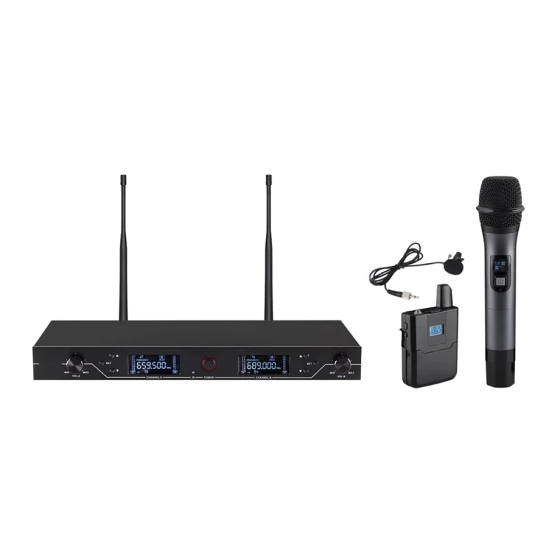 Сучасна бездротова мікрофонна система настільна, висотою 1U (1.75" або 44.45 мм). Ідеально підходить для виступів, оголошень, зустрічей або релігійних зборів інших заходів. Підходить для використання для звукової системи готелю, фабрики, школи, ресторану, вокзалу, церкви, мечеті. Система ключає в себе: двоканальний приймач з РК-дисплеєм. Два мікрофони працюють разом без будь-яких перешкод. Постачається з двома бездротовими мікрофонами (портативний і переносний) з фіксованою частотою. У кожному каналі 100 регульованих частот, всього 200. Підтримка відстані 500 метрів. Мікрофон живиться від DC3V, час роботи від батареї більше 10 годин, в режимі очікування 30 годин. Динамічний мікрофон, стійкий до пошкоджень, з високою чутливістю. Монтаж в стійку 19" (кріплення входять у комплект).