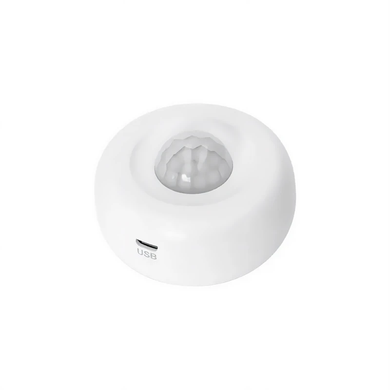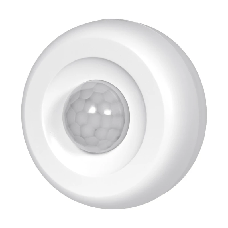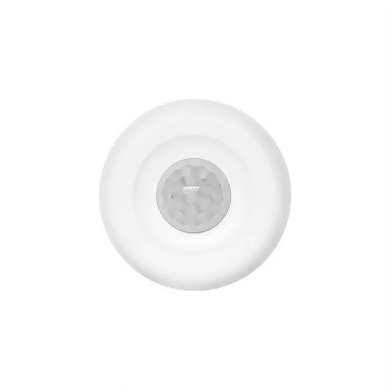 Бездротовий стельовий ІЧ-датчик руху з підтримкою WiFi 2.4 ГГц (IEEE 802.11b/g/n) та можливістю керування і налаштування через мобільний застосунок Tuya; працює без підключення до централі; дальність детекції 6 м, кут детекції 360°; живлення: 2 батареї AAA/LR03 3V, у комплекті; вхідна напруга DC 5 В/2 А (USB для зарядки лише придатних до цього акумуляторних батарей); споживання у режимі очікування 75 мкА, у режимі тривоги 60 мА; сповіщення про низьку напругу нижче 2.2 В; монтаж стельовий або настінний; кнопка скидання; робоча температура -10C° - +50°C; розміри Ø61 / 34 мм
