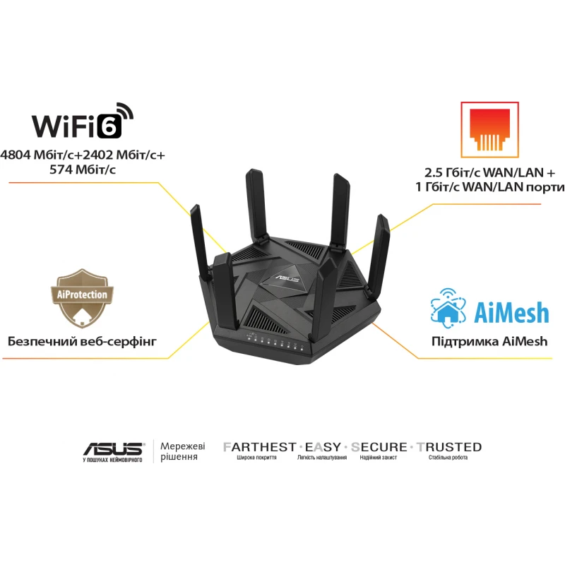Тридіапазонний маршрутизатор класу AXE7800: стандарт Wi-Fi 6E (802.11ax), новий діапазон 6 ГГц, ASUS Safe Browsing, система інформаційного захисту AiProtection Pro, підтримка спільного зашифрованого VPN-з’єднання (Instant Guard), засоби батьківського контролю, порт 2.5G Ethernet, об’єднання каналів Швидкісний стандарт Wi-Fi 6E. Новий діапазон частот 6 ГГц значно збільшує пропускну здатність мережі, забезпечує вищу продуктивність Wi-Fi і більш стабільне з’єднання зі швидкістю до 7800 Мбіт/с. Захист в один дотик. Функція ASUS Safe Browsing для блокування небажаного вмісту в один дотик, фільтрування результатів пошуку. Безпека будь-де. Вбудована система інформаційної безпеки AiProtection Pro на базі рішень Trend Micro. Де б ви не були, технологія ASUS Instant Guard забезпечує безпечний доступ в Інтернет за допомогою шифрованого VPN-з’єднання. Засоби батьківського контролю. Гнучкі налаштування для захисту дітей від Інтернет-загроз. Підтримка AiMesh. Легке розширення покриття бездротової мережі за допомогою AiMesh-сумісних маршрутизаторів ASUS.