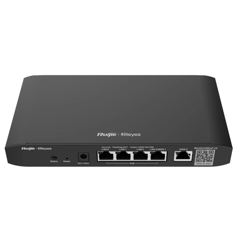 Інтелектуальний 5-портовий маршрутизатор, Зручне налаштування через веб-Ruijie Cloud, або мобільний додаток; 4 порти PoE/POE+, Потужності POE 54 Вт; 5 портів 10/100/1000M Base-T, підтримка до 2 портів WAN; RAM 128 МБ; ROM 16 МБ; Підтримка до 2 WAN, Пропускна здатність 500 Мбіт/с, Підтримка локальної переадресації роумінгу рівня L2/L3 між точками доступу, До 100 одночасних користувачів.