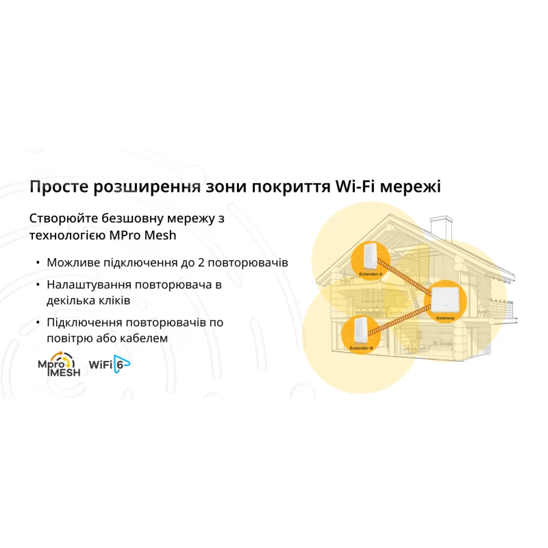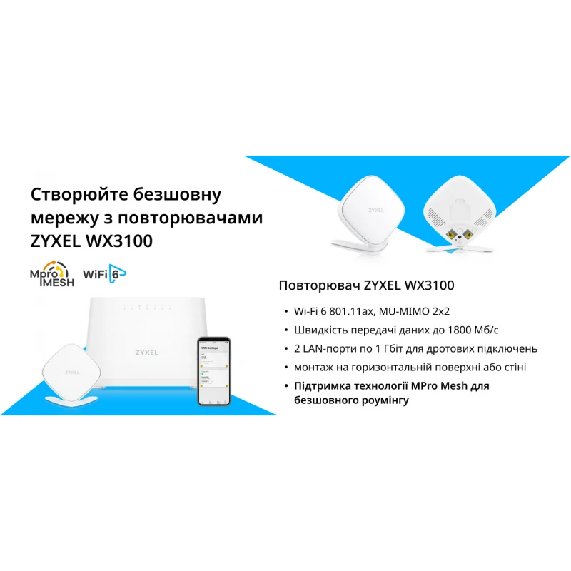 Zyxel EX3301-T0 - це новий універсальний маршрутизатор від компанії Zyxel з підтримкою найсучаснішого стандарту Wi-Fi 6 802.11ax. Роутер оснащений антеною формулою MU-MIMO 2×2 у діапазоні 2,4 та 5 ГГц відповідно і забезпечує сумарну швидкість до 1800 мб/с. Zyxel EX3301-T0 має 1 гігабітний WAN і 4 гігабітні LAN-порти, а також USB 2.0 для підключення зовнішнього flash-накопичувача або LTE-модему як резервний канал зв'язку. Окремо потрібно відзначити 2 FXS-порти для підключення IP-телефонів. Завдяки своєму функціоналу Zyxel EX3301-T0 стане повноцінним шлюзом для аналогової телефонії. Однією з головних рис цього роутера є підтримка технології MPro Mesh, яка робить розширення мережі неймовірно легким і швидким. Для цього вам знадобиться Wi-Fi повторювач Zyxe WX3301-T0 та програма MPro Mesh. Буквально за 2 кліки повторювач встановить з'єднання повітрям з маршрутизатором і про «мертві» зони в квартирі або приватному будинку можна забути.