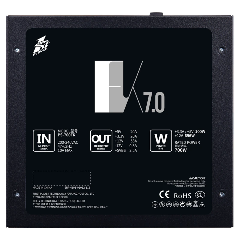 1st Player PS-700FK - універсальний і надійний блок живлення потужністю 700 Вт, який відповідає сучасним потребам персональних комп"ютерних систем. Він забезпечить високу надійність і ефективність з тихою роботою - найкраща комбінація характеристик, продуктивності і якості в своєму класі за відмінною ціною. В елементній базі блоку живлення застосовані надійні і довговічні конденсатори, а для запобігання виходу блоку живлення з ладу використовується безліч різних технологій захисту. Стильна Циклічна RGB-Підсвічування (Flow) Блок живлення Cylon оснащений світлодіодним підсвічуванням RGB, який надає системі особливо стильного вигляду. Є 13 різних ефектів підсвічування, які можна перемикати спеціальною кнопкою. Підтримка адресованої RGB Підсвічування Можливість вибору з 16,8 мільйонів кольорів дозволяє підібрати індивідуальний варіант підсвічування. Цей блок живлення сумісний з материнськими платами RGB, що адресуються, що використовують адресований роз'єм RGB +5 В. ККД понад 85% Є сертифікат за стандартом 80 Plus 230 В ЄС, що підтверджує високий ККД. Вбудований APFC (активний компенсатор коефіцієнта потужності) >0,9.