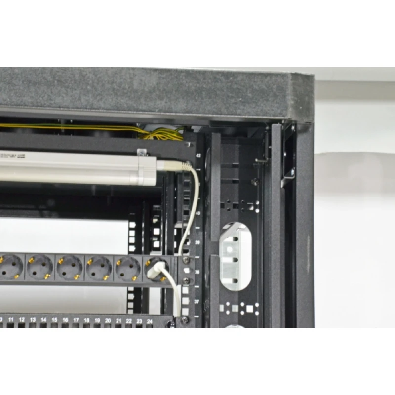 - Возможна установка в серверные шкафы шириной 800 мм, где присутствует пространство между внешними стенками и вертикальными направляющими