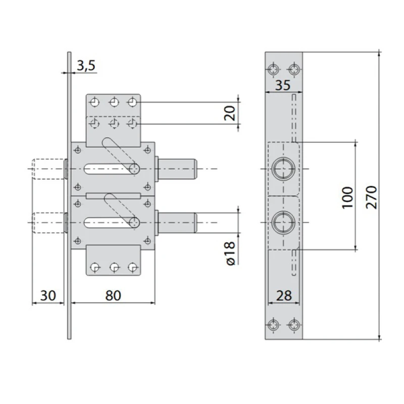 - Оснащен двумя круглыми стальными ригелями Ø 18 мм.