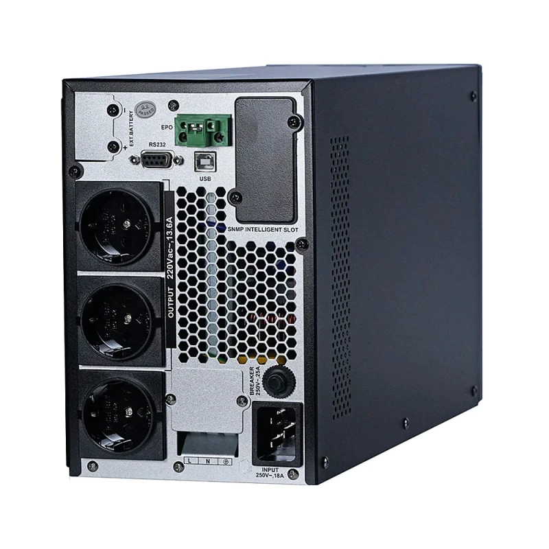 - Вихідна потужність онлайн ДБЖ складає 3000 ВА / 3000 Вт, коефіцієнт потужності дорівнює 1.