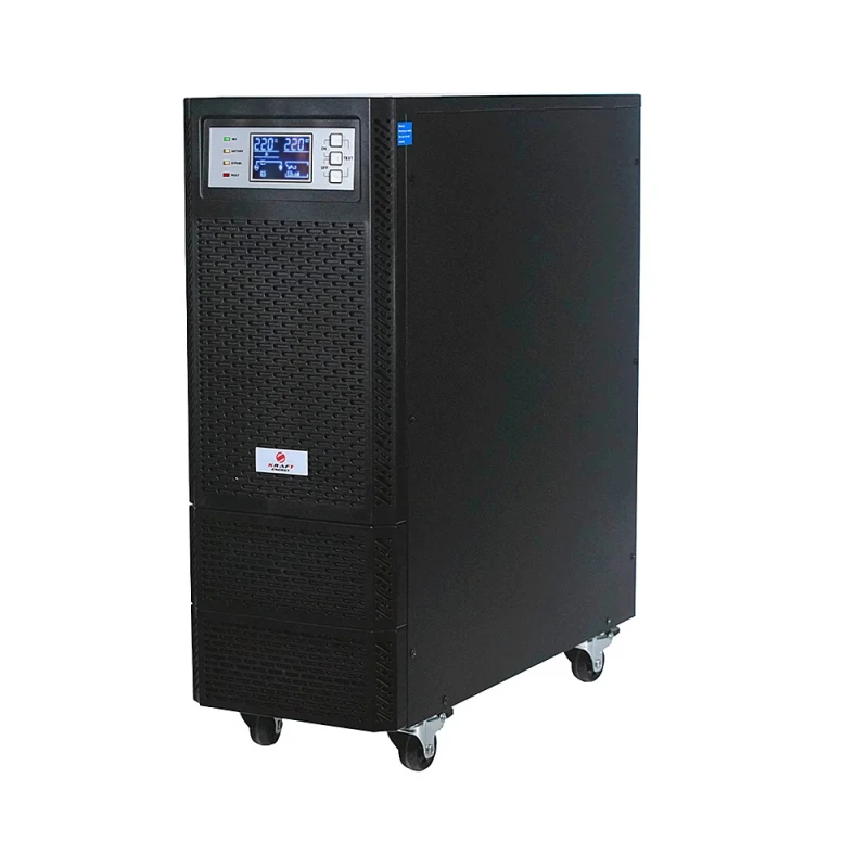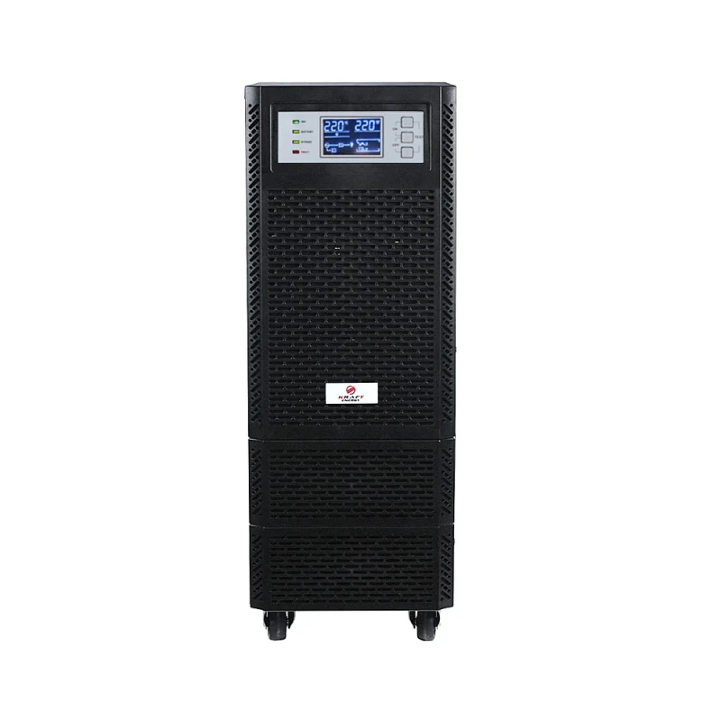 Джерело безперебійного живлення KRF-T6000VA/5400W(LCD) Pro Online UPS, онлайн (подвійного перетворення), потужністю 6000 ВА / 5400 Вт, з правильною синусоїдою, вбудовані акумуляторні батареї 144 В DC (12шт * 12 В/7 Аг), струм заряду максимум 4 А, LCD-дисплей. Підходить для котлів.