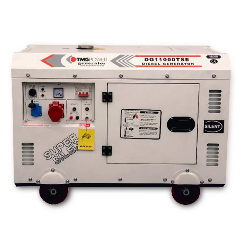 TMG Power DG 11000TSE трифазний генератор. Номінальна потужність 7.5 кВт, максимальна потужність 8 кВт. Тип двигуна: 4-х тактний одноциліндровий з повітряним охолодженням. Система запуску: Електростартер. Об'єм паливного бака: 30 л. Об'єм мастила: 1.6 л. Регулювання напруги: AVR. Матеріал обмотки альтернатора: Мідь. Робочий рівень шуму (7 м): 74 дБ. Клас захисту: IP23