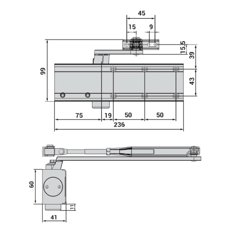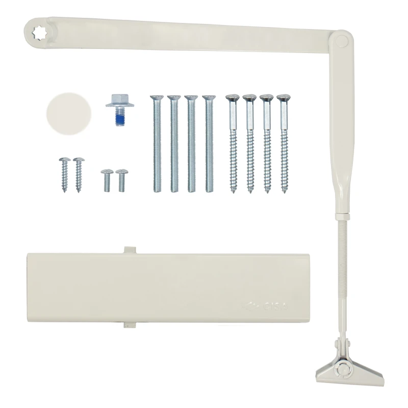 Также в данной модели сила закрывания EN 2-4 регулируется вращением винта на боковой части корпуса. В данной комплектации присутствует стандартная тяга с фиксацией дверного полотна в открытом положении до 130°. Это дает возможность оставить дверь открытой для проветривания или удобства пользования в коммерческих помещениях.