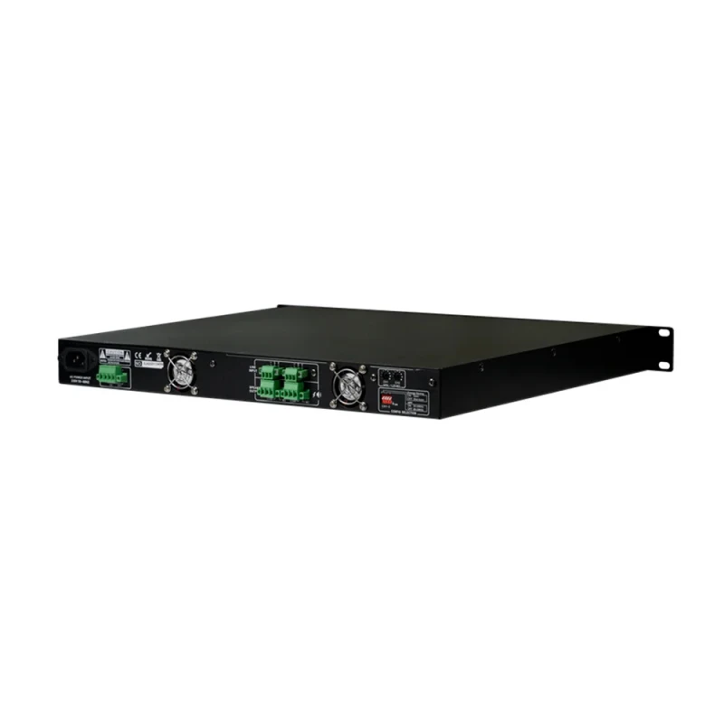 Двоканальний підсилювач CMX DA-2500, 19" класу D розроблений на технології перемикання потужності, що відрізняється мінімальним енергоспоживанням і набагато вищим ККД до 85%, крім того, він допомагає заощадити місце у стійці, генерувати менше тепла, щоб збільшити його продуктивність і таким чином продовжити термін експлуатації. Підсилювач потужності серії DA-500 має номінальну вихідну потужність 120 Вт, 240 Вт, 350 Вт та 500 Вт, тому його можна використовувати як з мікшером, так і з підсилювачем для налаштування системи гучного зв'язку або комерційної аудіосистеми з мінімальними витратами. Універсальні виходи на гучномовці з високим імпедансом 100 В та низьким імпедансом 8 Ом дозволяють використовувати його як при стаціонарній установці PA, так і при установці стереозвуку Hi-Fi. Балансні лінійні входи через роз'єм Phoenix для кожного каналу з регулюванням посилення. Динамік має виходи як на 100, так і на 8 Ом. Вихідні вбудовані фільтри високих частот можуть бути увімкнені або вимкнені за допомогою попереднього налаштування мікроперемикача. Автоматичний перехід в режим очікування після відсутності вхідного сигналу протягом однієї хвилини, негайне пробудження при появі будь-якого вхідного сигналу. Візуальні індикатори робочого стану включають захист, затискач, вхід та вихід для полегшення спостереження. З повним захистом від короткого замикання, перевантаження, високої температури, затиску та постійного струму. Перемикач джерела живлення змінного струму від 115 В до 230 В і 24 В постійного струму.