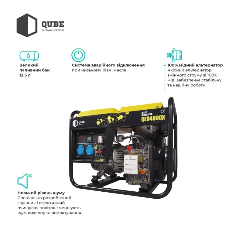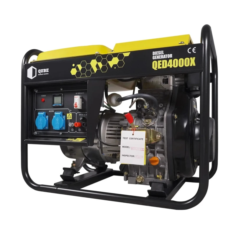Ця машина може виробляти максимальну потужність до 3 кВт, тоді як швидкість обертання досягає 3000 обертів за хвилину, забезпечуючи оптимальну продуктивність за будь-яких обставин. Обладнаний двигуном CF178F, який завдяки збільшеній зносостійкості блоку циліндрів гарантує довговічність та надійність. Використання якісних матеріалів у поєднанні з надійною системою фіксації клапанів забезпечує стабільність роботи та простоту обслуговування. QUBE QED4000X також оснащений надійним масляним насосом, який забезпечує постійне змащування двигуна, що збільшує його термін служби. На додаток до цього пристрій обладнано ручним насосом, за допомогою якого користувач може легко перекачувати дизельне паливо з бака в паливну систему, що робить процес заправки не тільки зручним, але і швидким. Генератор має дві розетки для підключення різного обладнання, а його високоякісний повітряний фільтр ефективно видаляє забруднення, захищаючи двигун та продовжуючи його термін служби. Крім того, QED4000X має ступінь захисту IP23, що забезпечує його безпеку при використанні в умовах високої вологості. Доповнює характеристики цієї моделі ємний дизельний бак на 12,5 літри, що забезпечує тривалий час роботи без необхідності частої заправки. Генератор QUBE QED4000X – це ефективний, надійний та зручний в обслуговуванні пристрій, який стане незамінним помічником для будь-яких енергозалежних завдань.
