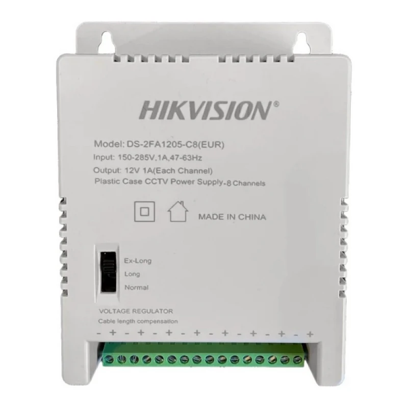 Імпульсне джерело живлення Hikvision DS-2FA1205-C8 (EUR) – це багатоканальний імпульсний пристрій для надійного та ефективного живлення різноманітного обладнання, що працює на постійному струмі 12 В. Цей блок живлення призначений особливо для відеокамер та інших засобів спостереження, забезпечуючи їм стабільну енергію в широкому діапазоні вхідних напруг – від 150 до 285 В.