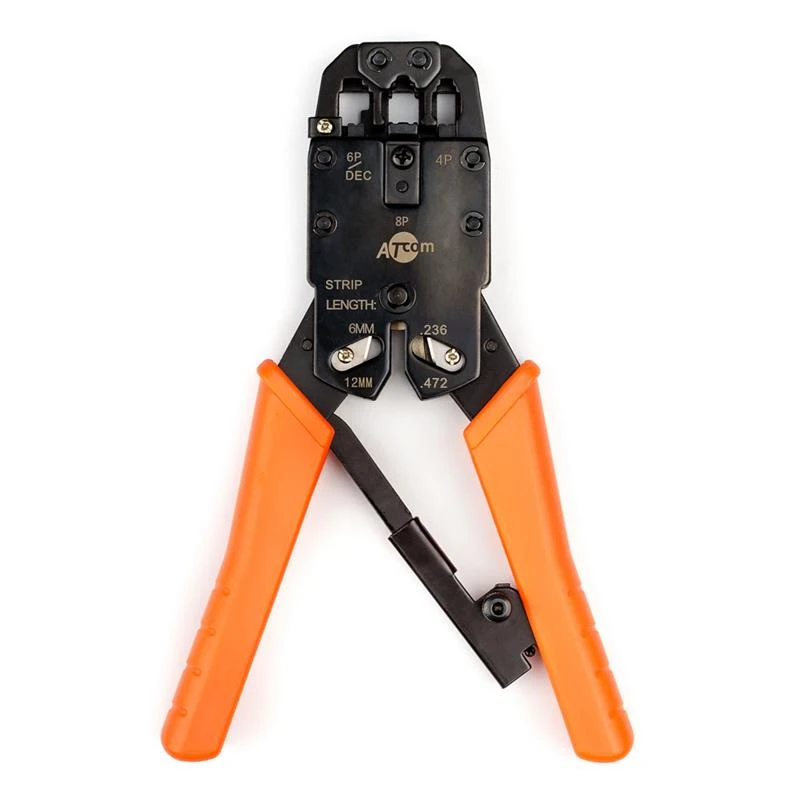 Багатофункціональний професійний обжимний інструмент ATcom 2008R, з різаком і зачисткою ізоляції. Обтиск: 8P8C-RJ45; 6P6C-RJ12; 6P4C-RJ11; 4P4C; 4P2C; & 6P6C-DEC; і екранованих 8P8C-RJ45 модульних вилок.