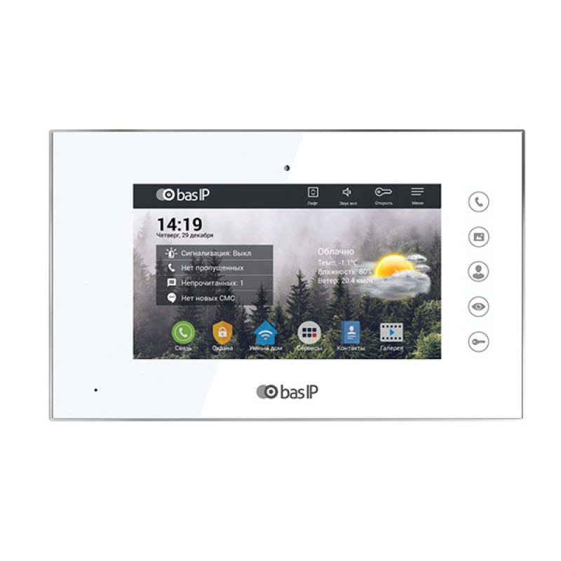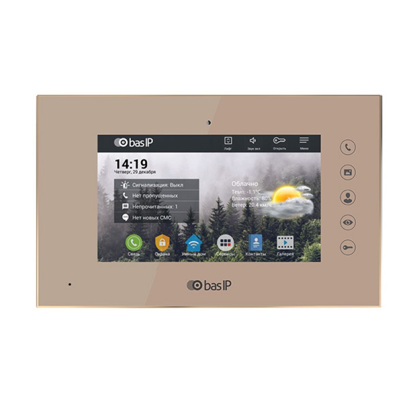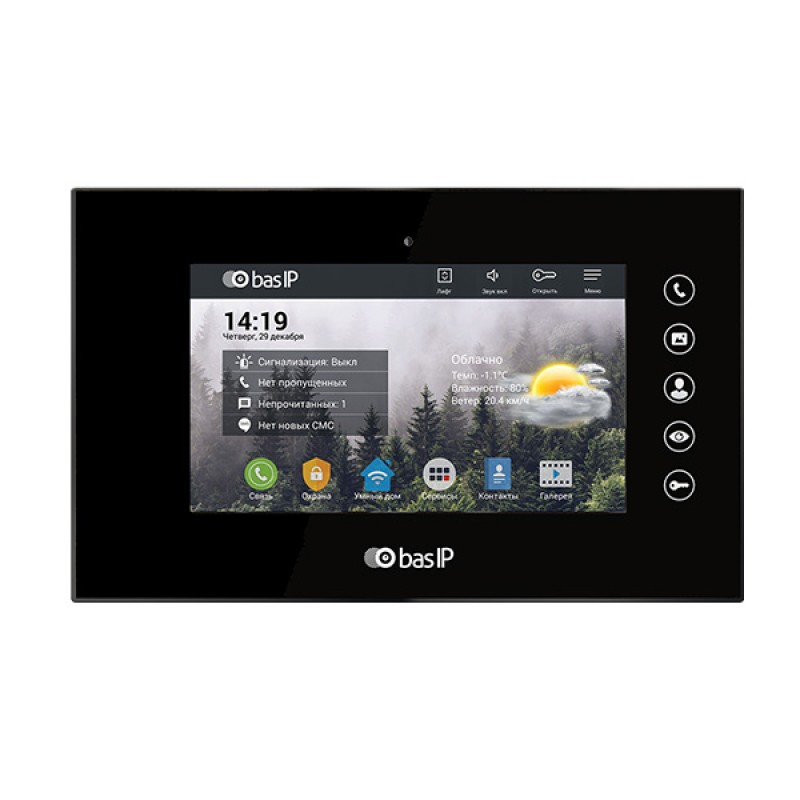 Цветной видеодомофон AQ-07 v.4 с 7-дюймовым сенсорным экраном и сенсорными кнопками управления. Переадресация вызова с вызывной панели на смартфон с помощью приложения BAS-IP Intercom. Подключение к интернету. Материал корпуса - пластик+металл.