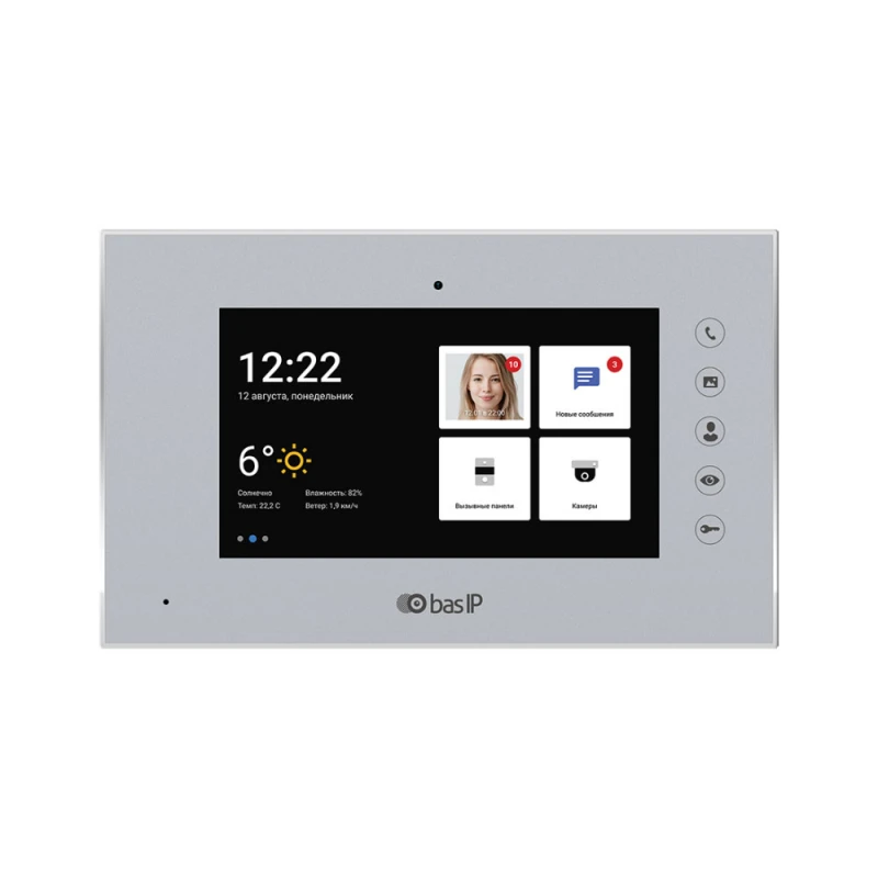 Цветной видеодомофон AQ-07L silver с 7-дюймовым сенсорным экраном и сенсорными кнопками управления. Переадресация вызова с вызывной панели на смартфон с помощью приложения BAS-IP Intercom. Подключение к интернету. Материал корпуса - пластик + металл.