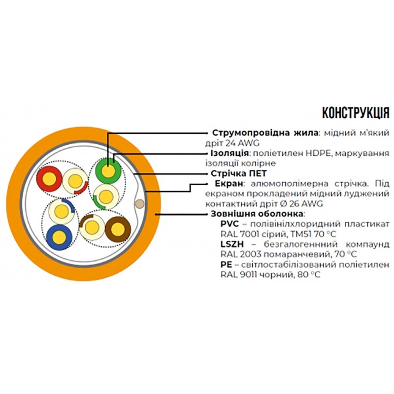 Категорія: Cat. 5e. Матеріал жили: мідь. Кількість жил: 4х2. Перетин жили: 0.51 мм². Тип оболонки: ПВХ. Температура експлуатації: від -20°С до +60°С. Номінальна частота: 350х10^6 Гц. Мінімальний радіус вигину при прокладанні: 4 зовнішні діаметри. Ізоляція: поліетилен