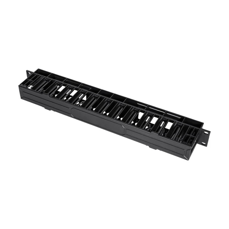 Кабельний організатор горизонтальний пластиковий на 12 портів, з кришкою; монтаж у комутаційні шафи 19"; висота 1U; матеріал вогнестійкий пластик; розміри 482 / 43 / 84 мм