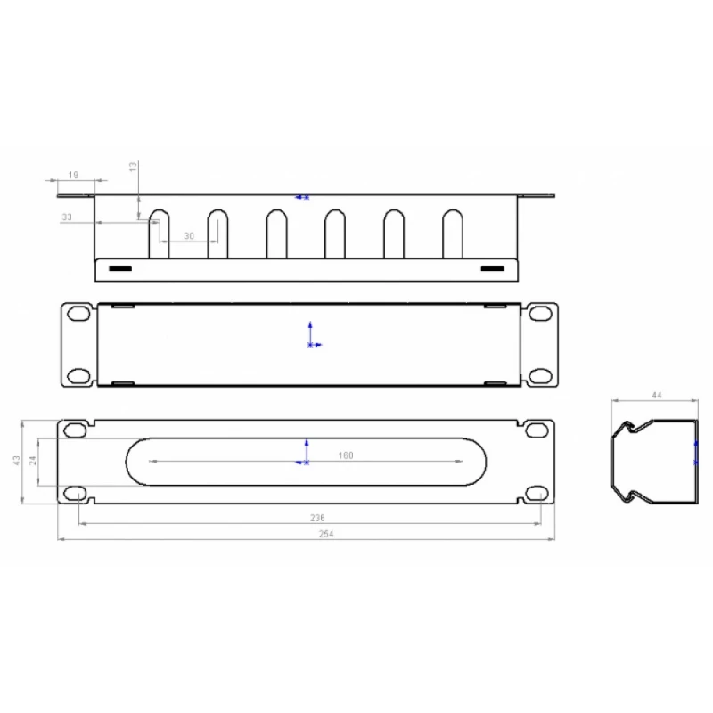 - На боковых стенках присутствует 6 прорезей шириной 10 мм, что позволяет завести патч-корды S/FTP (cat. 6a, 7, 7a) без давления на их оболочку