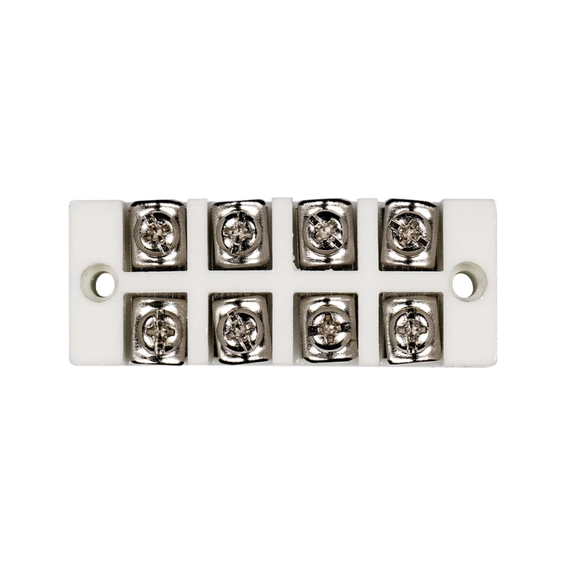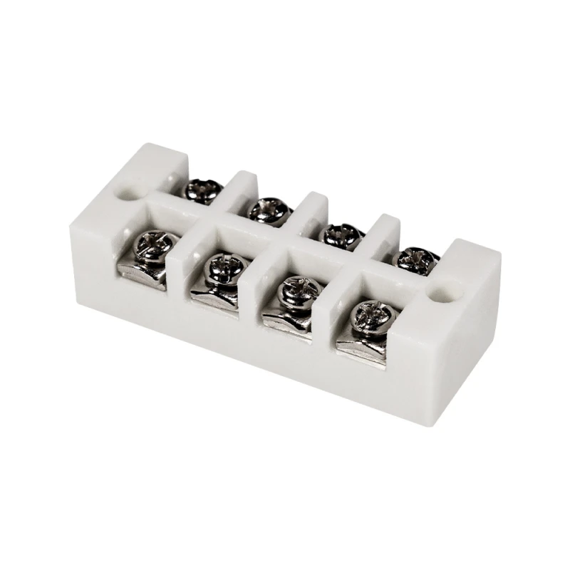 Керамічна клема з 4 полюсами, з відкритими контактами, з зовнішнім підключенням дротів. Номінальна напруга 500 В, струм 20 А. Розміри 65 / 22.5 / 16 мм, вага 68 г