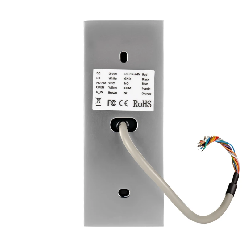 Автономна клавіатура/контролер з вбудованим зчитувачем карт і брелків стандарту Mifare (13.56 Mhz) контроль доступу по відбитку пальця, є підсвічування клавіатури дальність зчитування карт 2-5 см, металевий антивандальний корпус, WG26 вхід, ємність: 10 000 карт пальців, відкриття дверей: мапа, код, відбиток пальця, час відкриття дверей 0~99 сек, ступінь захисту: IP65, живлення: DC12В-24В/30мА, габарити: 139х70х22 мм, робоча температура -40℃~60℃.