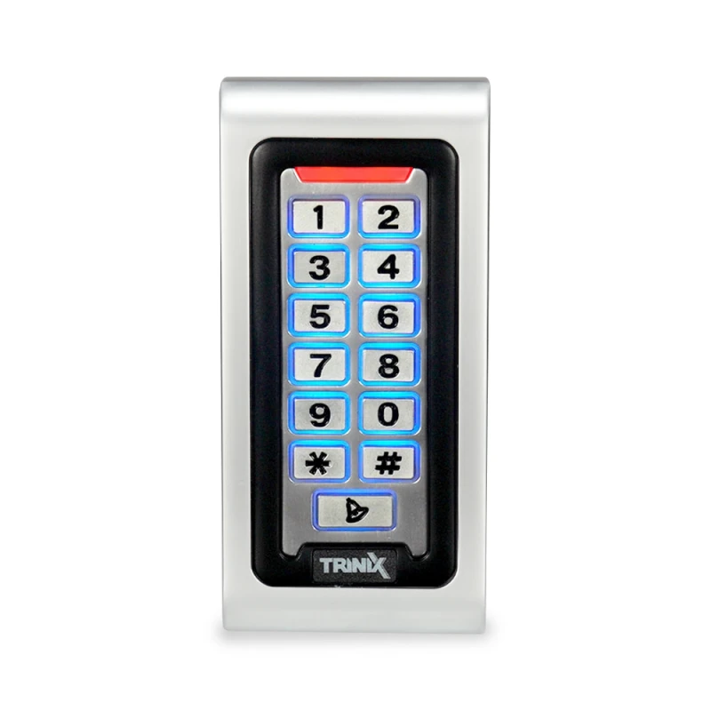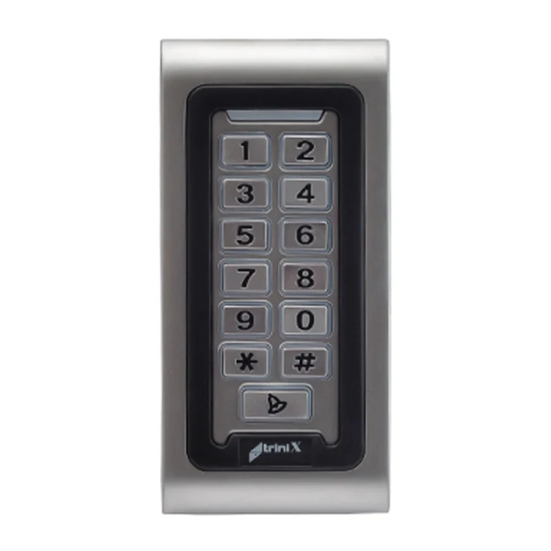 Вулична, антивандальна, водонепроникна кодова клавіатура Trinix TRK-800WA з металевими кнопками та вбудованим зчитувачем карт та брелоків стандарту EM-Marine (125 kHz), а також контролером на одне реле для використання у системах контролю доступу.