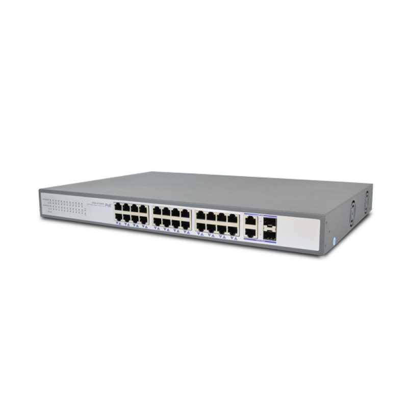 28-портовый неуправляемый PoE AF коммутатор PoE-10026-24P-4S с 24 портами РоЕ, которые могут автоматически определять и подавать питание устройствам на базе стандарта IEEE 802.3af, поддерживающим стандарт питания PoE IEEE802.3af (Wi-Fi точка доступа, IP-телефон, IP-камера и др.).